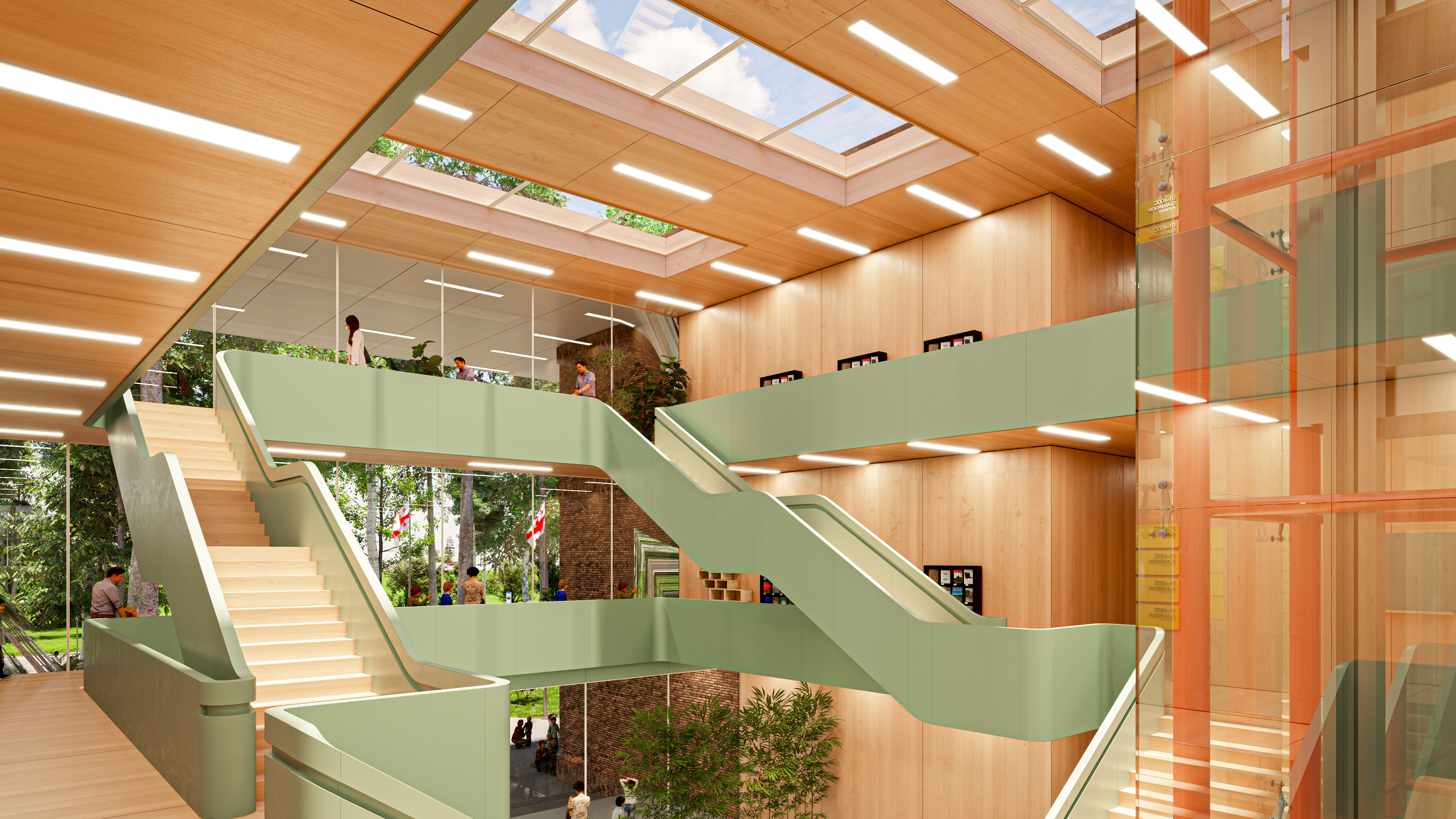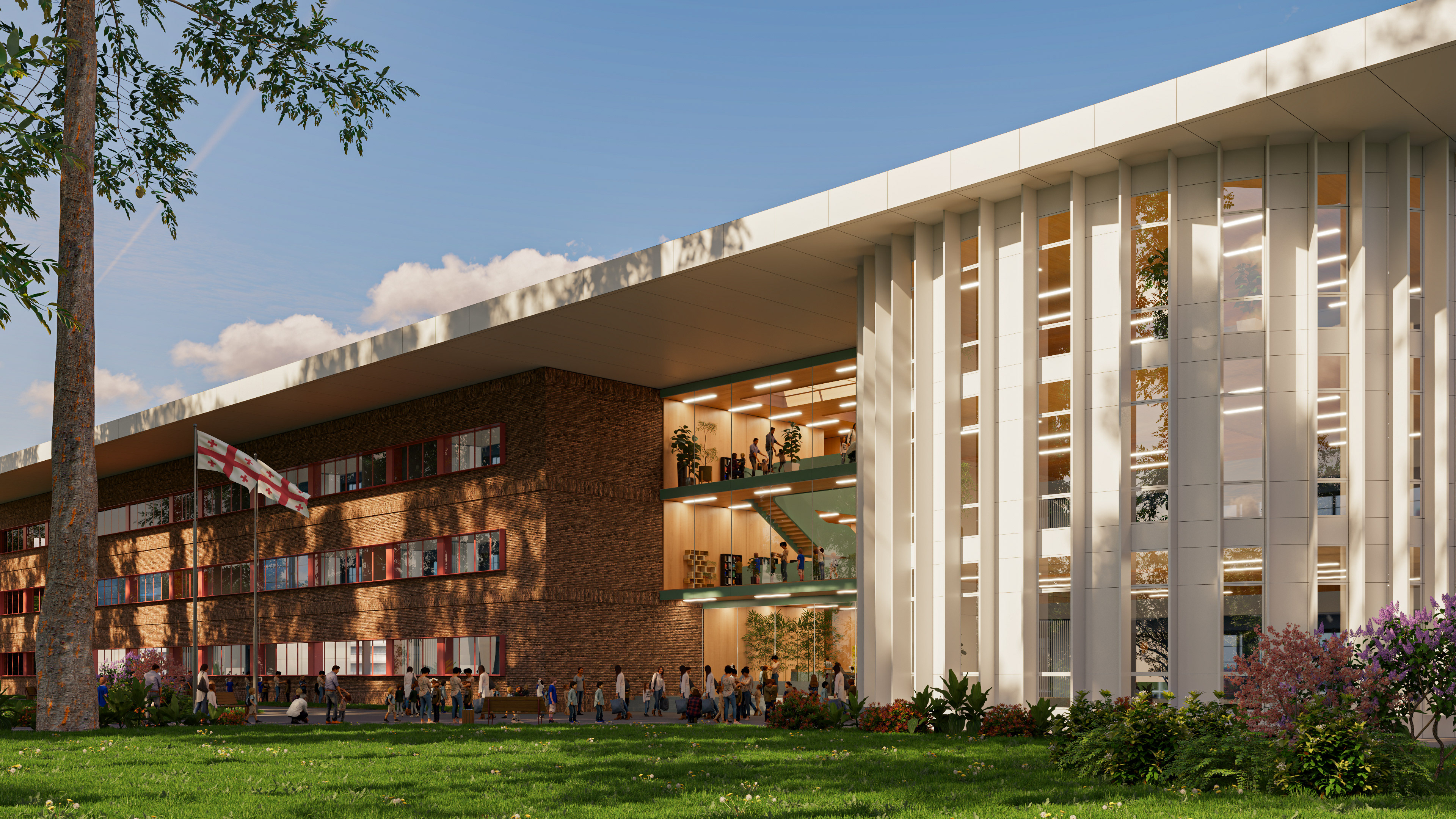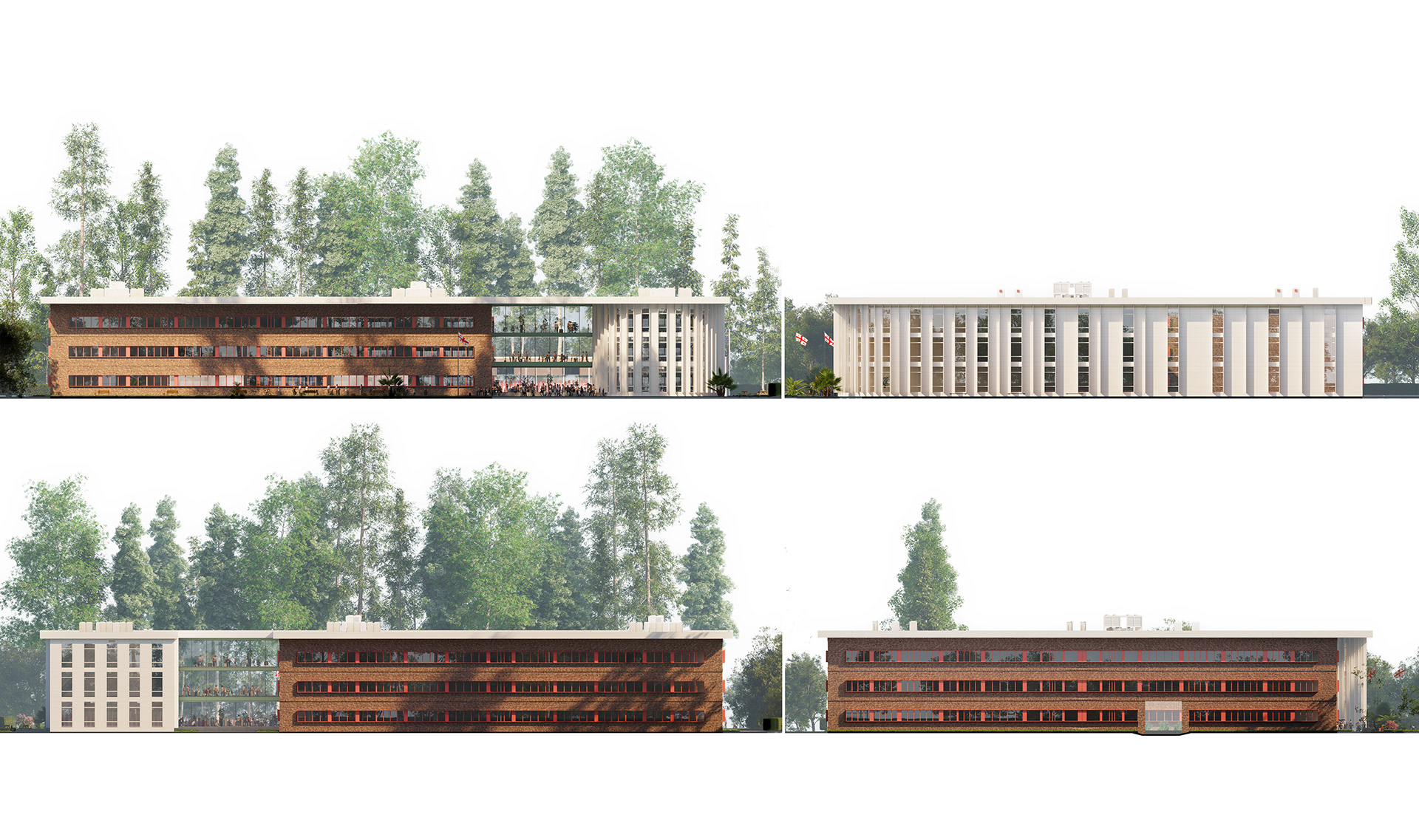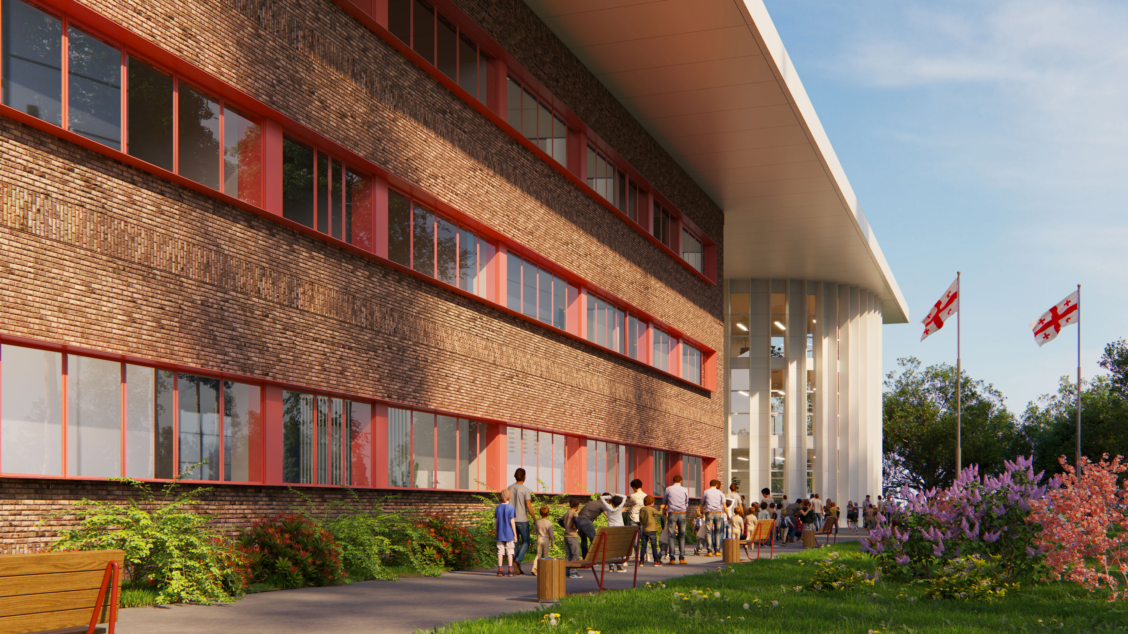 The Public School project in Chakvi, Adjara, is a modern educational facility designed to replace an aging building with an inspiring and durable learning environment. The architectural concept creates a symbolic bridge between the past and the future by combining a classic natural brick academic block with a contemporary white entry wing. This design focuses on simple, effective solutions that foster healthy social interaction among students and teachers while ensuring the building remains a beautiful urban landmark for decades to come. The spacious interior is filled with natural light and includes specialized areas such as science laboratories, a dedicated information technology center, and a large sports hall. Outside, the project features extensive greenery and sports courts designed to provide natural shade and create a welcoming communal space for daily student activities