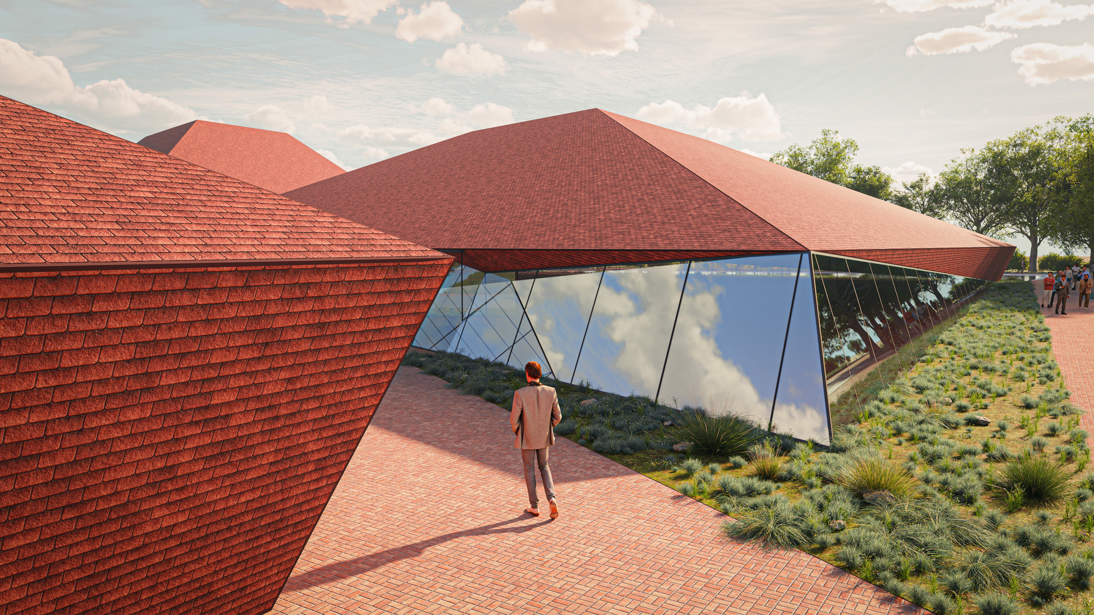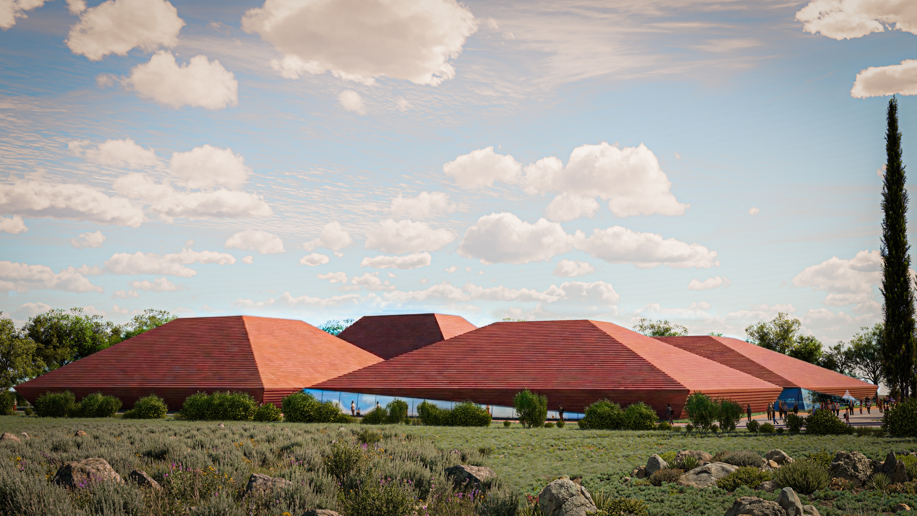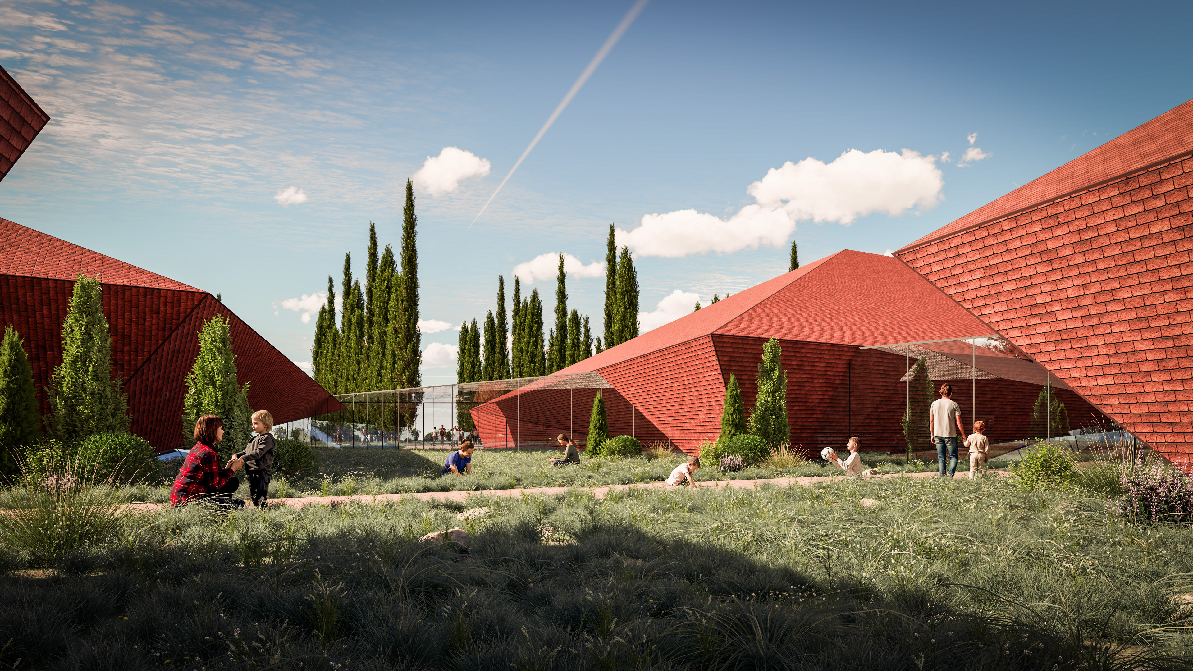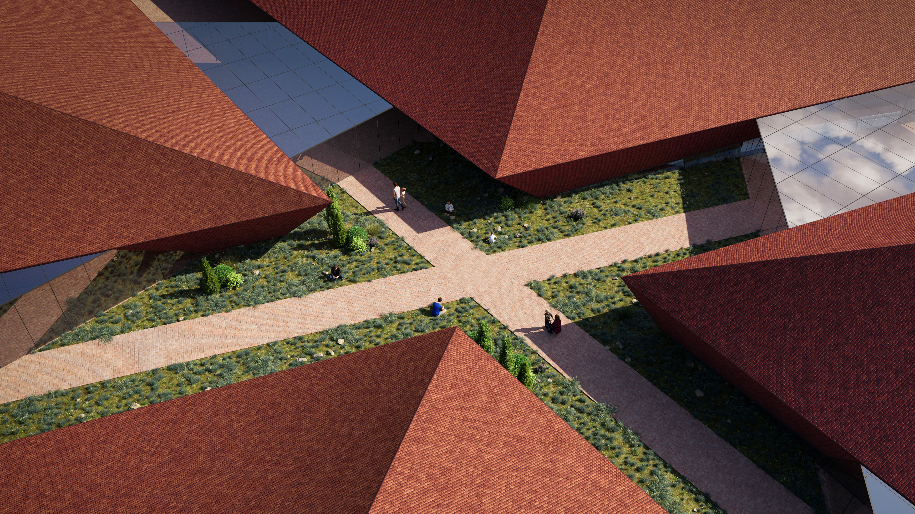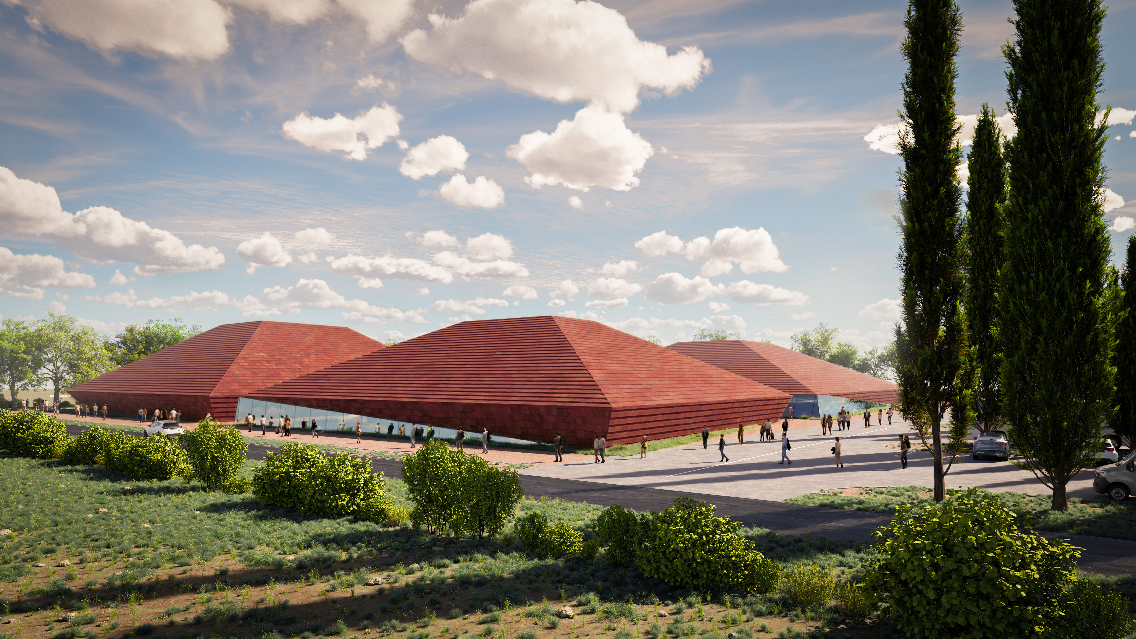 The Tsnori Multifunctional Complex is a competition proposal featuring a modular architectural design composed of four independent blocks. This strategic fragmentation allows the complex to harmonize with the local low-rise urban fabric of the Sighnaghi municipality by reducing the building's perceived mass. The complex is divided into specialized zones, including an aquatic block with a $30\times25$ m international standard pool , two sports blocks for disciplines such as judo, boxing, and volleyball , and a cultural-educational block housing a library and media center. Architecturally, the project utilizes a metal frame system and is characterized by terracotta ceramic shingle facades that reinterpret the traditional tile roofs of the region. These solid volumes are elevated upon a continuous glass belt, creating a "floating" effect while maximizing natural lighting and energy efficiency through Low-E glazing.