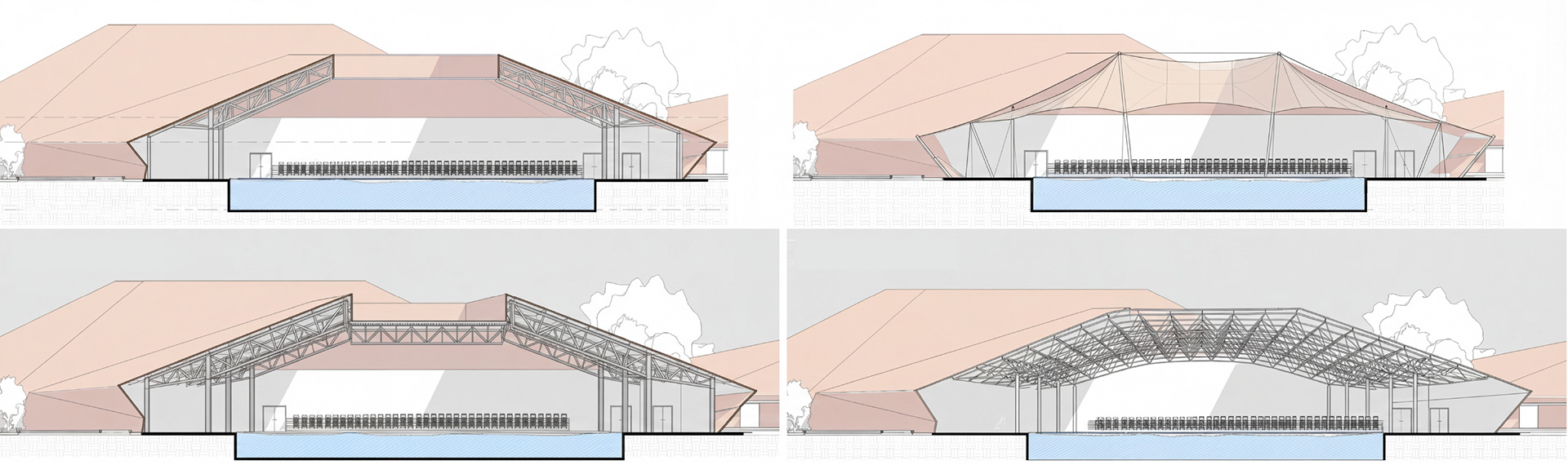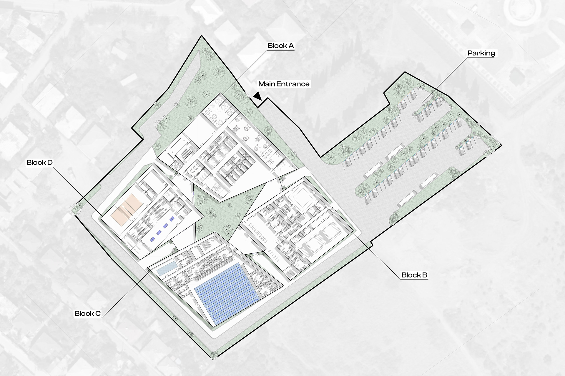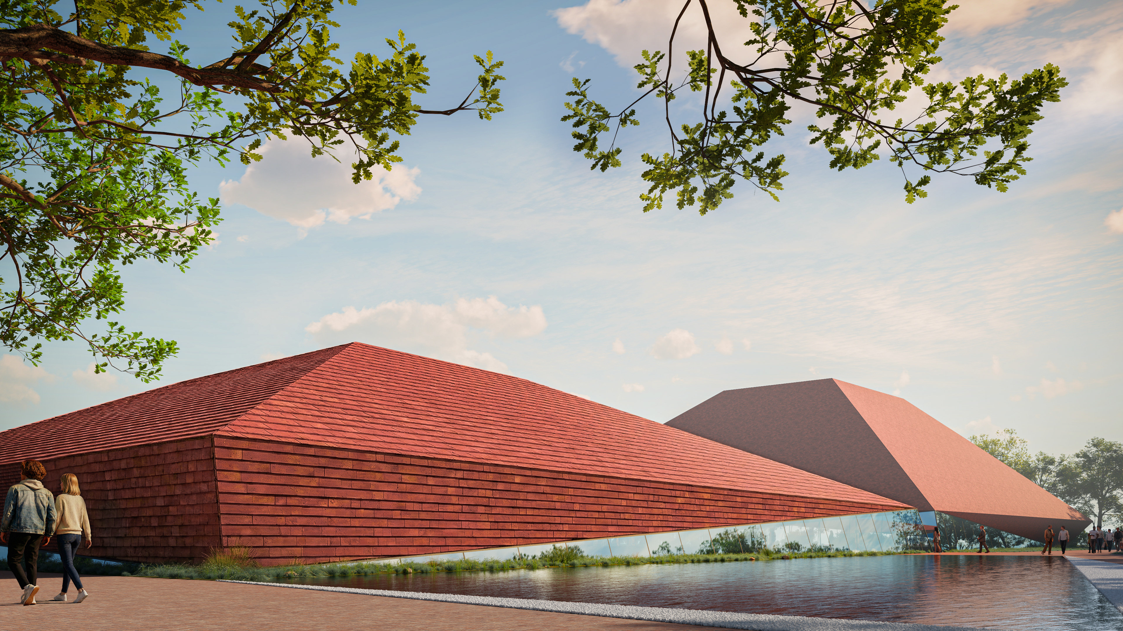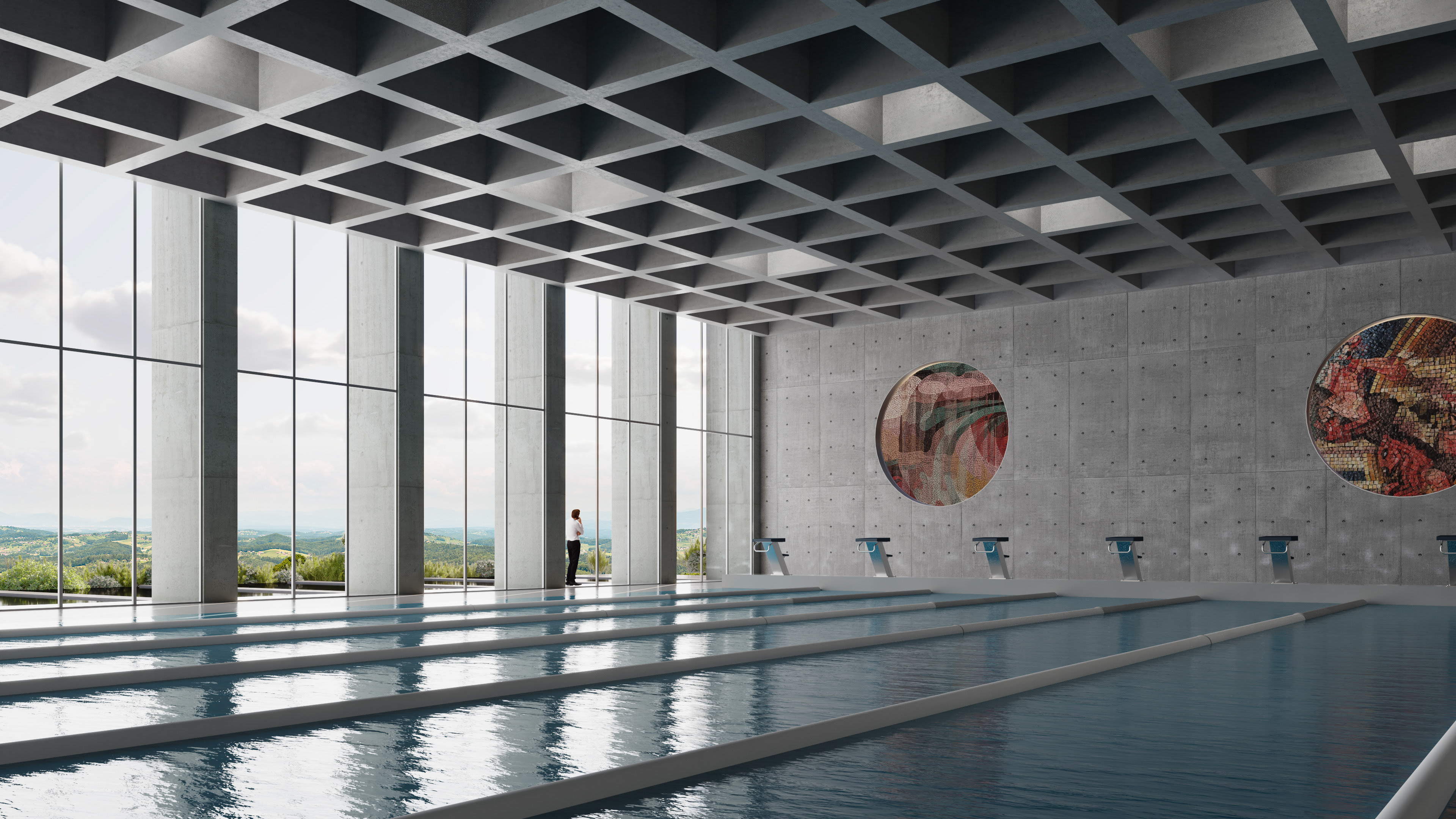The Tsnori Multifunctional Complex is a competition proposal featuring a modular architectural design composed of four independent blocks. This strategic fragmentation allows the complex to harmonize with the local low-rise urban fabric of the Sighnaghi municipality by reducing the building's perceived mass. The complex is divided into specialized zones, including an aquatic block with a $30\times25$ m international standard pool , two sports blocks for disciplines such as judo, boxing, and volleyball , and a cultural-educational block housing a library and media center. Architecturally, the project utilizes a metal frame system and is characterized by terracotta ceramic shingle facades that reinterpret the traditional tile roofs of the region. These solid volumes are elevated upon a continuous glass belt, creating a "floating" effect while maximizing natural lighting and energy efficiency through Low-E glazing.