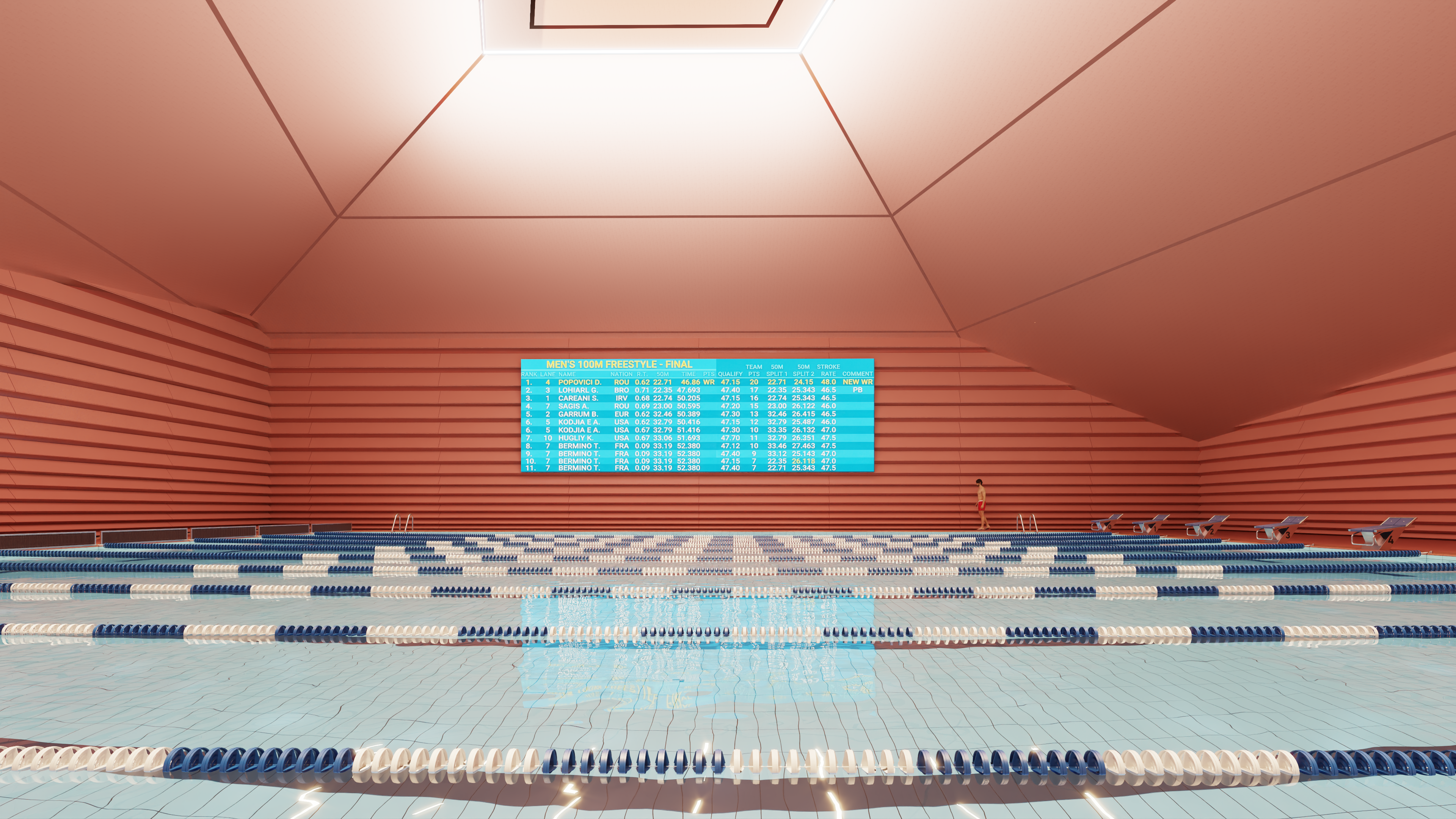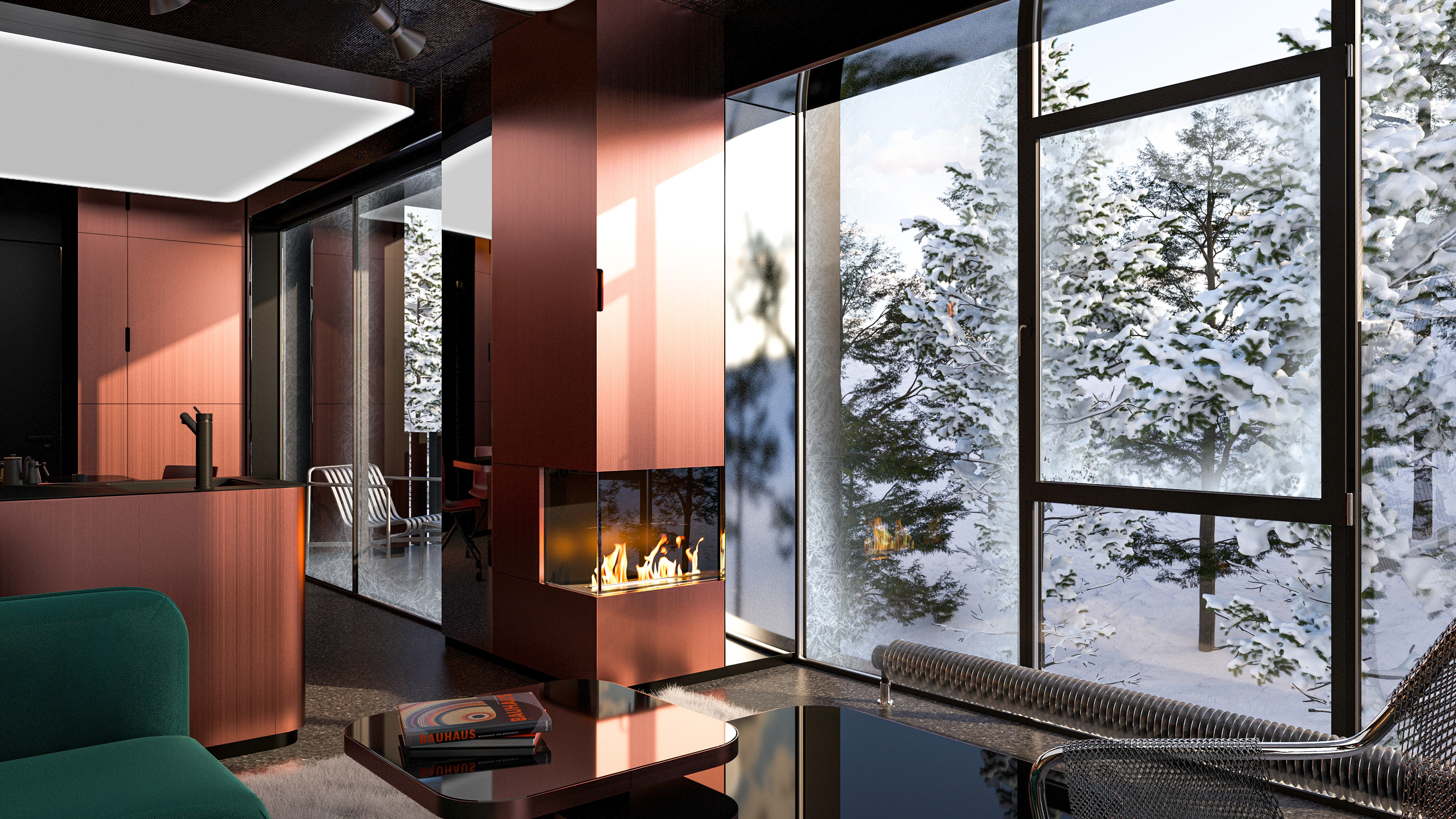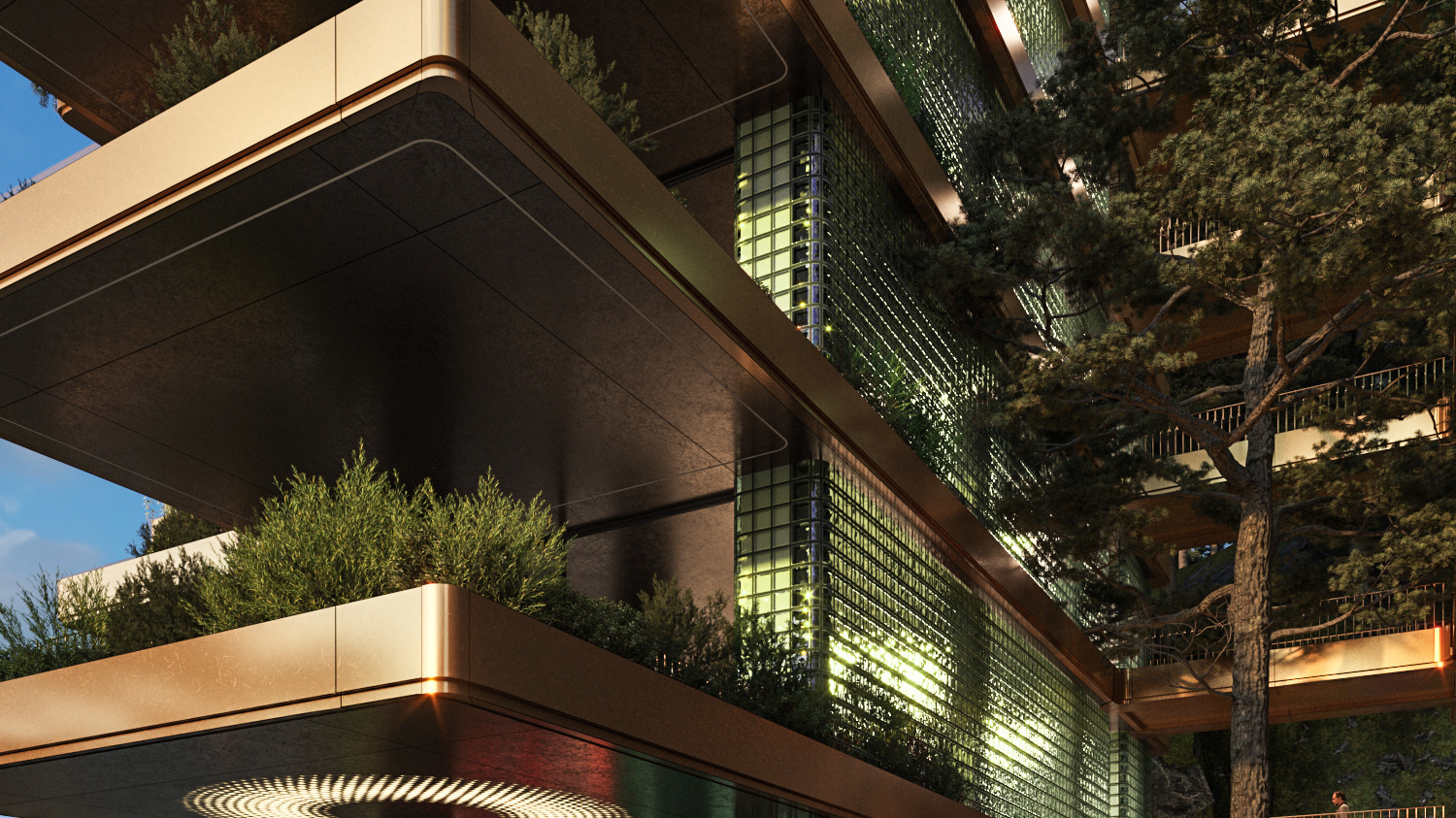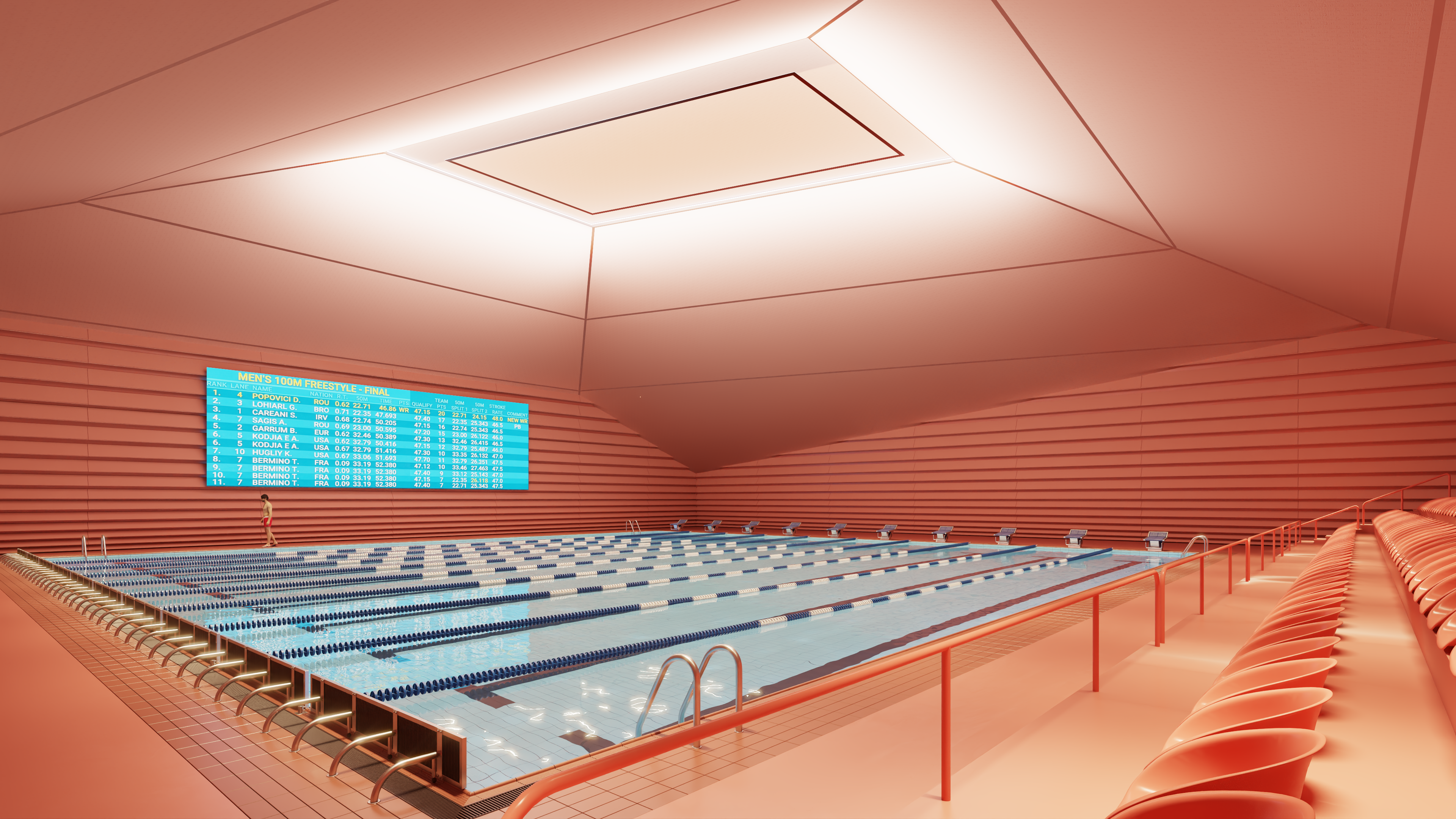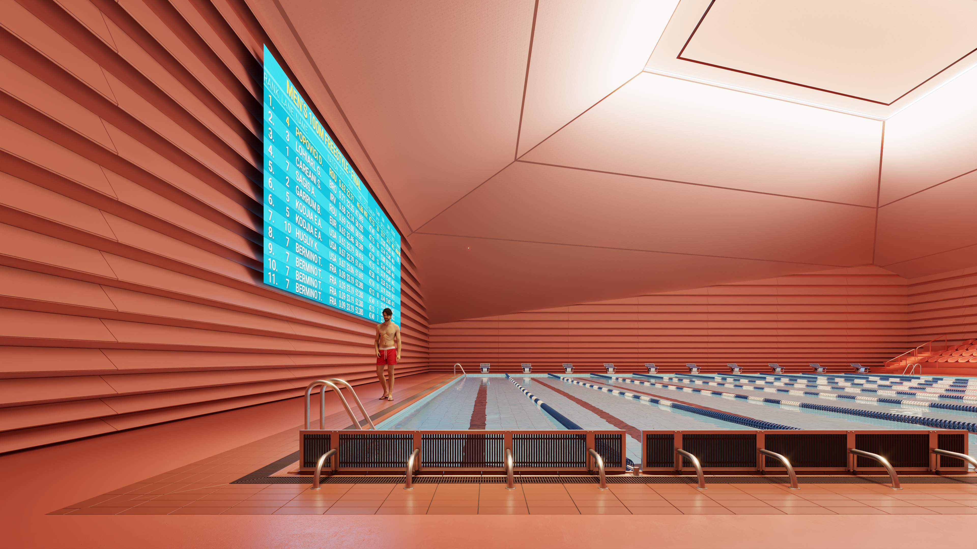 The Tsnori Multifunctional Complex is a competition proposal featuring a modular architectural design composed of four independent blocks. This strategic fragmentation allows the complex to harmonize with the local low-rise urban fabric of the Sighnaghi municipality by reducing the building's perceived mass. The complex is divided into specialized zones, including an aquatic block with a $30\times25$ m international standard pool , two sports blocks for disciplines such as judo, boxing, and volleyball , and a cultural-educational block housing a library and media center. Architecturally, the project utilizes a metal frame system and is characterized by terracotta ceramic shingle facades that reinterpret the traditional tile roofs of the region. These solid volumes are elevated upon a continuous glass belt, creating a "floating" effect while maximizing natural lighting and energy efficiency through Low-E glazing.